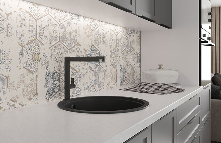 Kuhinja je opremljena ručkom F.412.056 AL, crna, metalna, s opcijskom veličinom od 128 mm ili 224 mm.