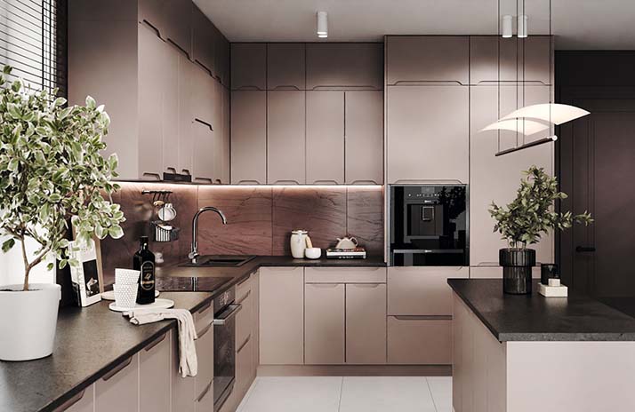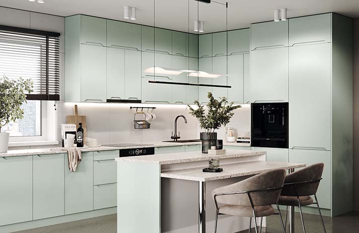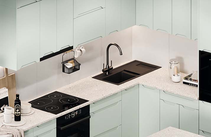Prednji dijelovi kuhinje izrađeni su od MDF-a u boji bijele svile, sladoleda, slonovače, moche, latte, sivi baršua,
