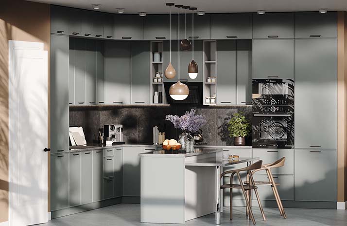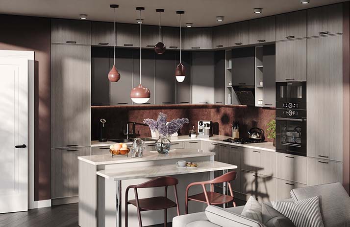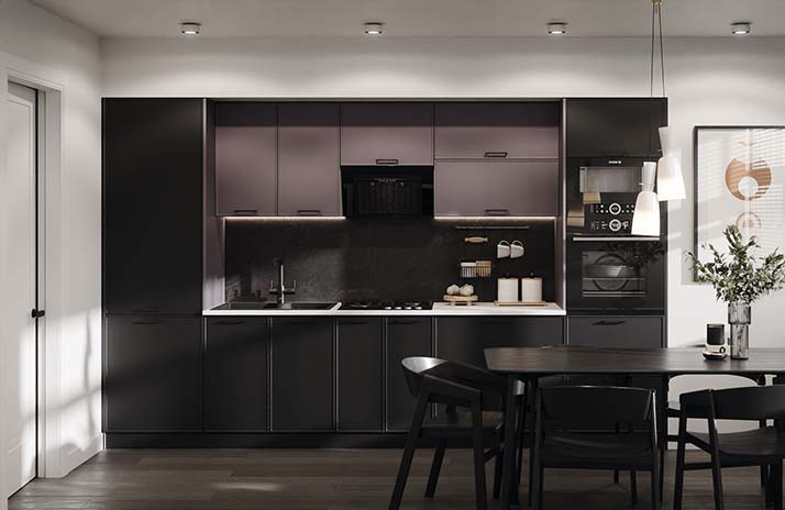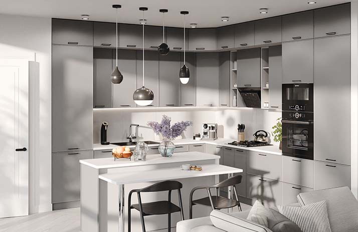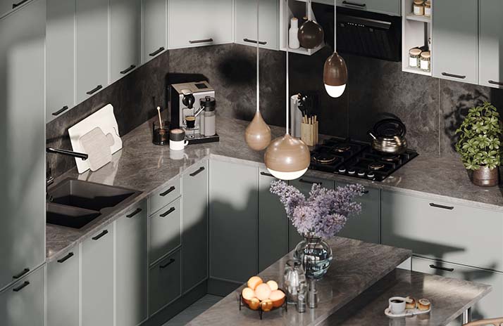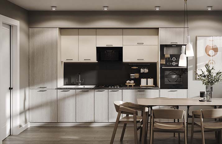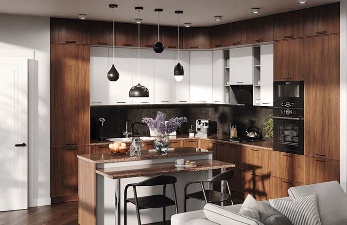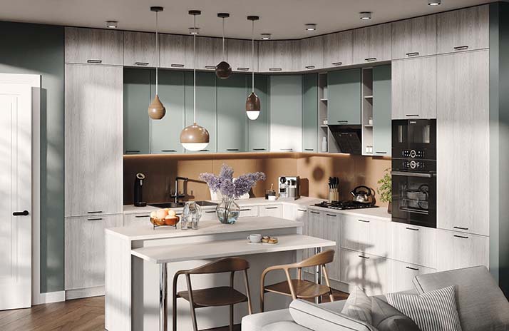 i zlatnog zanatskog hrasta. Prednji dijelovi kuhinje izrađeni su od MDF-a u bojama bijela supermat,